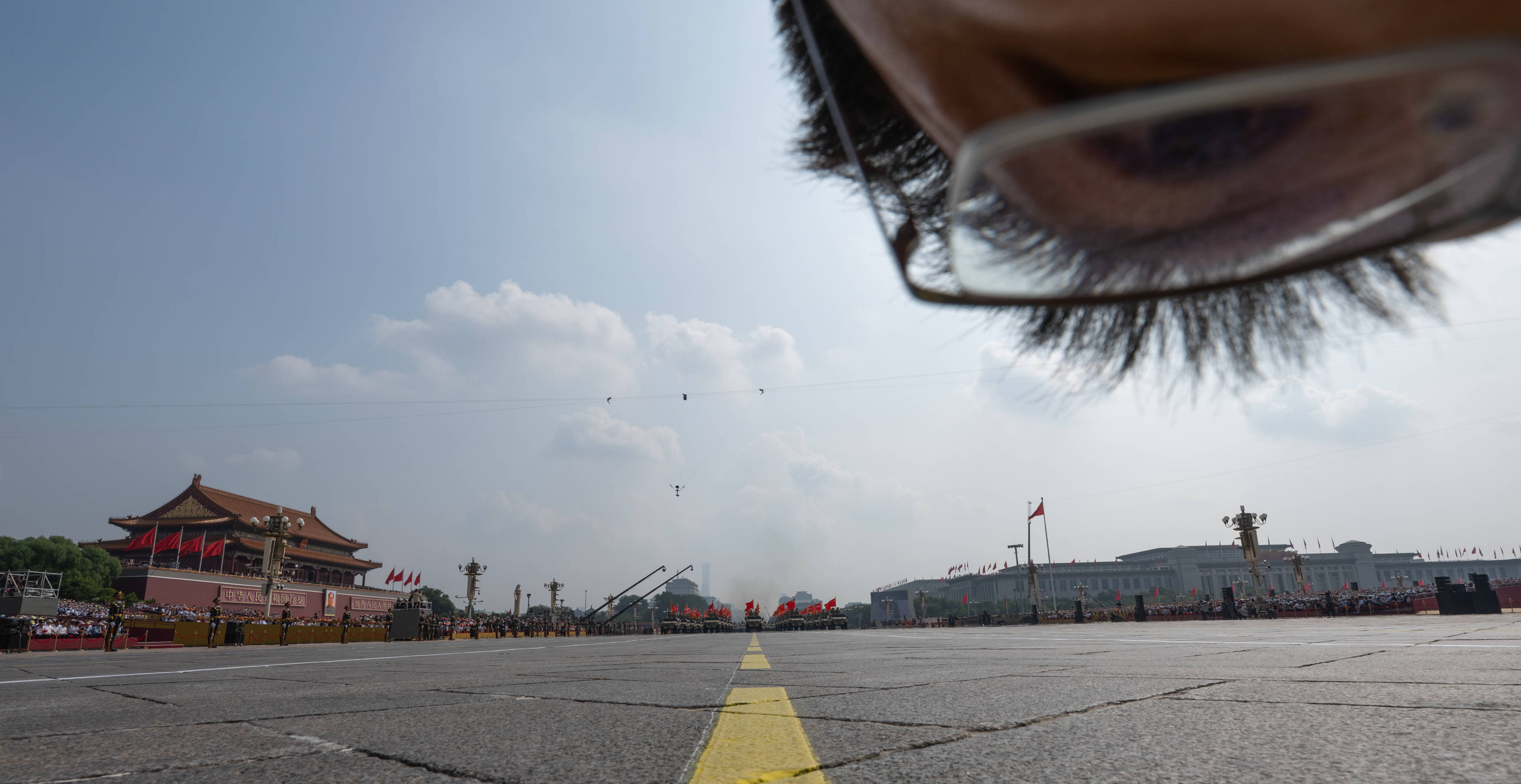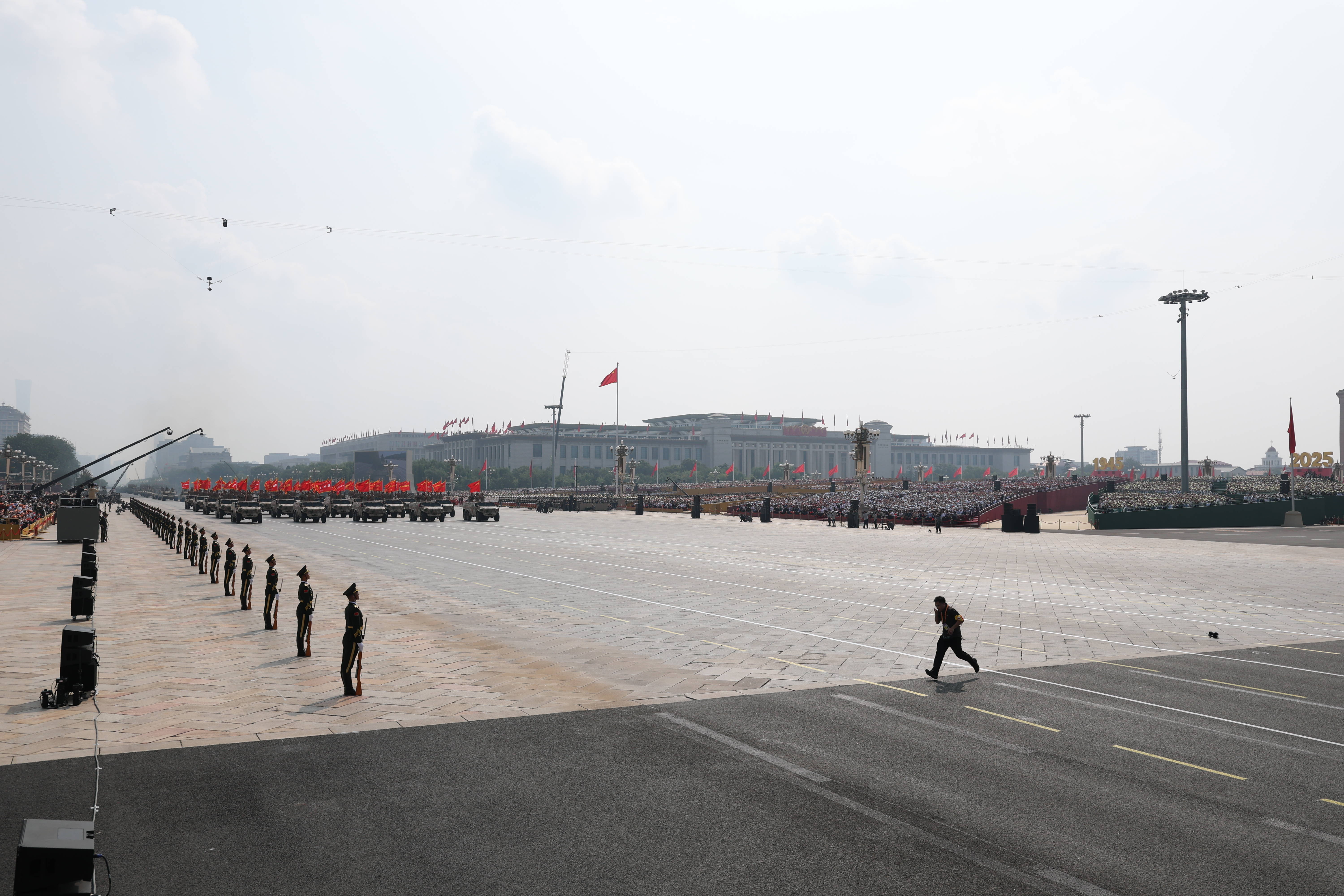 9月3日,纪念中国人民抗日战争暨世界反法西斯战争胜利80周年大会在北京隆重举行。这是核导弹第一方队接受检阅。新华社记者 肖艺九 摄9时59分,最后一个徒步方队以整齐划一、坚定有力的步伐朝我而来,此时我的心也开始飞快地跳动,我大口呼吸,试图让自己能够稳住。方队通过后,我立刻抱起设备,数着线标,一口气冲到安全线位置,放置、调整、撤离。跑回点位后,我喘着粗气,迅速拎起另一台相机,继续拍摄,因为我知道,这样重大的历史现场,错过了就再也没有了,一定得全力以赴。