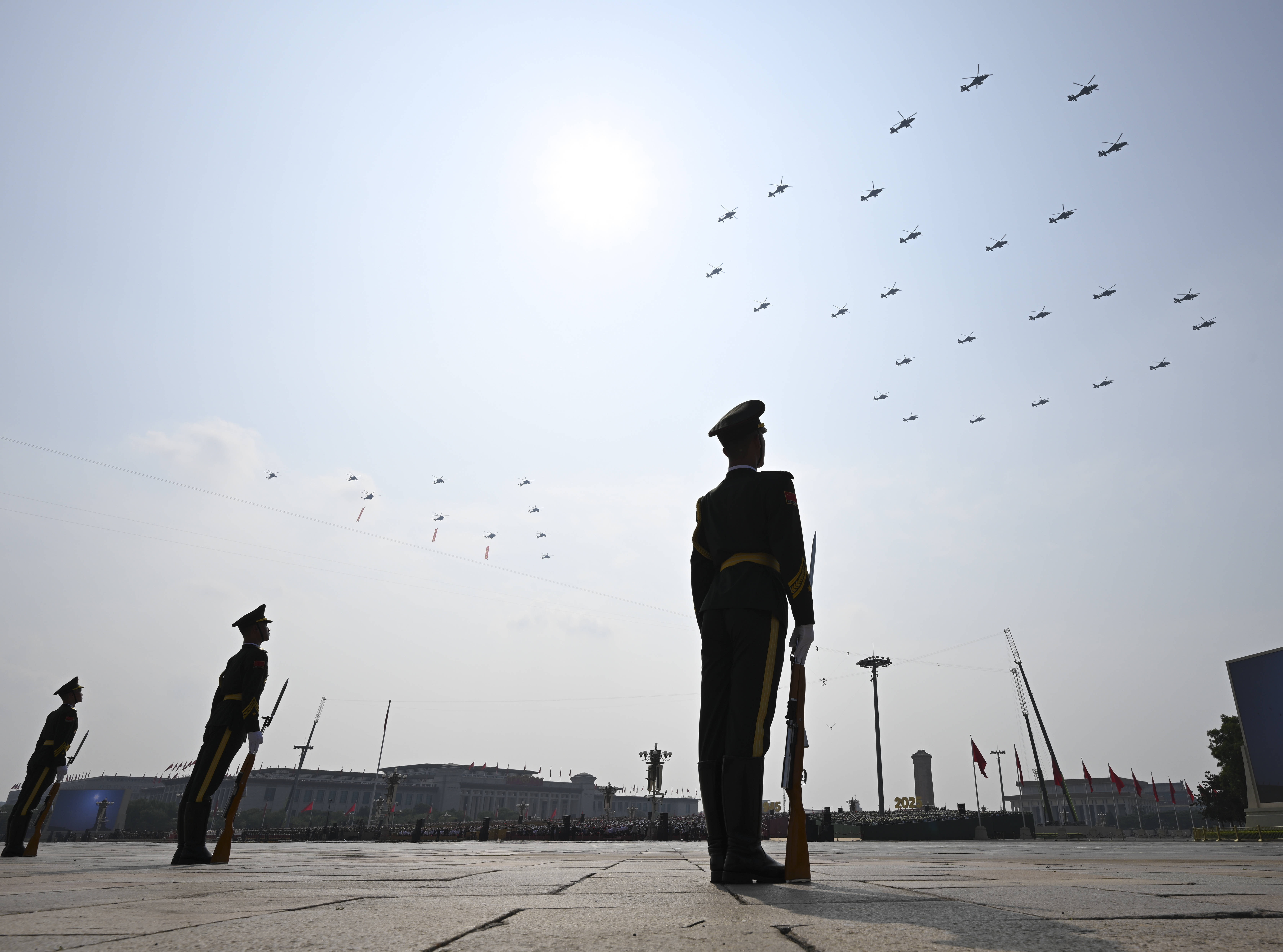 9月3日,纪念中国人民抗日战争暨世界反法西斯战争胜利80周年大会在北京隆重举行。这是空中护旗梯队飞过天安门广场上空,26架直升机汇成巨大的“80”字样。新华社记者 肖艺九 摄蓝天雄鹰列阵长空,铁甲雄师滚滚向前。此时的情感化作一声声清脆的快门,凝固一个个壮怀激烈的精彩瞬间,记录下这将铭刻于历史的“高光时刻”。