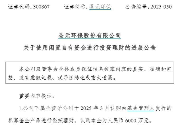 【大河财立方消息】原是为提高资金使用效率、谋求更佳投资回报而配置的私募基金产品,在持有将近9个月后,却发现已亏损近4700万。在认定基金管理人及托管人存在违规后,圣元环保股份有限公司(证券简称:圣元环保)果断选择报警。