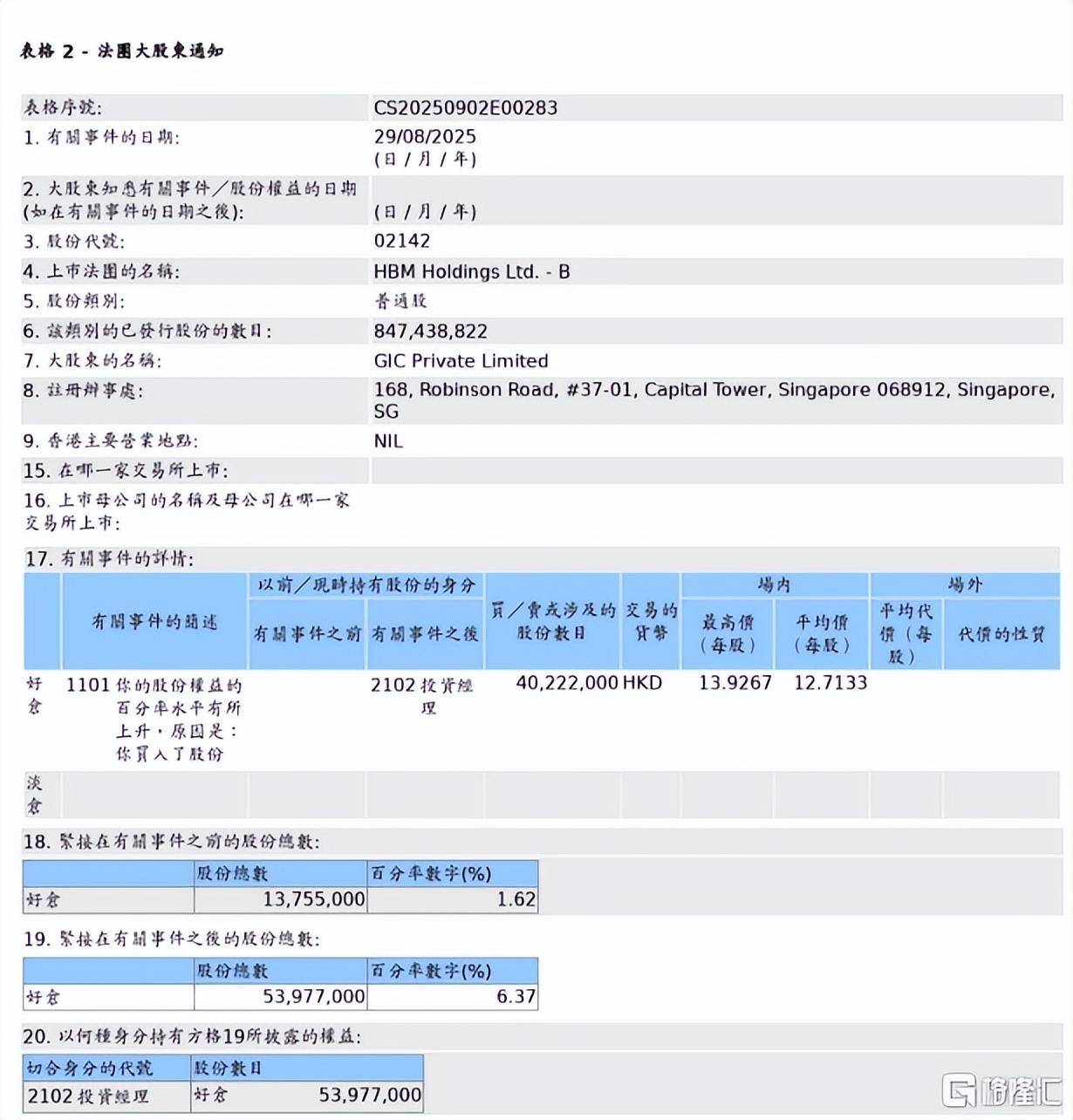 根据香港联交所9月2日披露的文件,新加坡政府投资公司(GIC Private Limited)于8月29日以每股均价12.7133港元增持和铂医药-B (02142.HK)4,022.2万股普通股股份,每股作价12.7133港元,价值约5.11亿港元。增持后,新加坡政府投资公司最新持股数目为5,397.7万股股份,好仓比例由1.62%升至6.37%,跻身公司重要战略投资者行列。