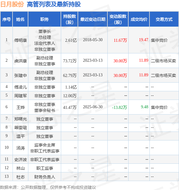日月股份的高管列表及最新持股情况如下: