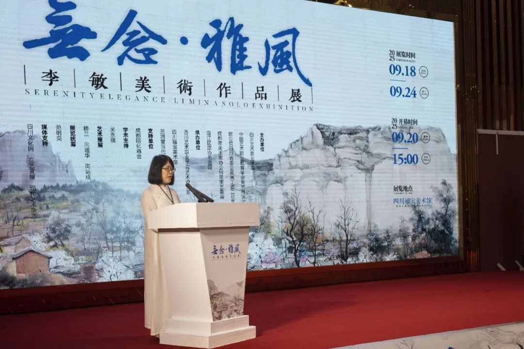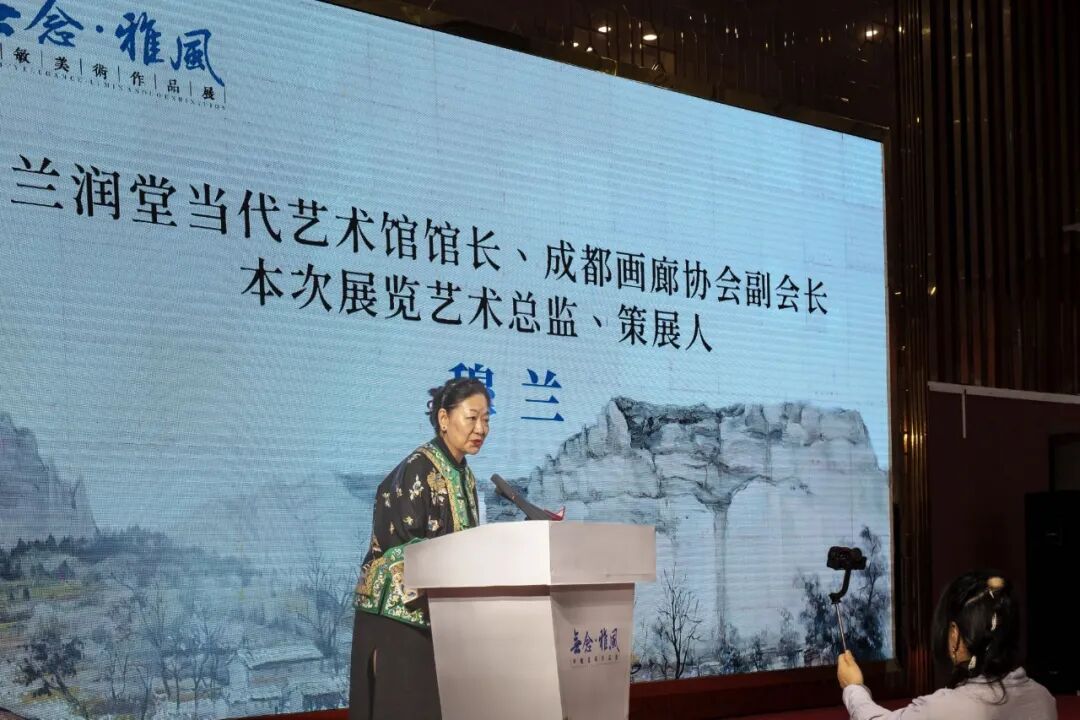 展览策展人、𠄘办方代表,中国语文报刊协会演讲与口才分会副会长、四川省音乐家协会副主席、兰润堂当代艺术馆馆长、成都画廊协会副会长穆兰女士致辞